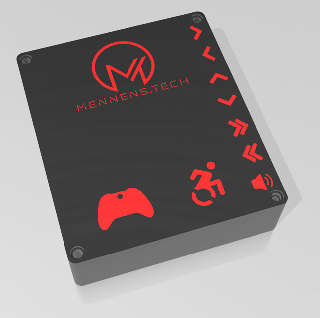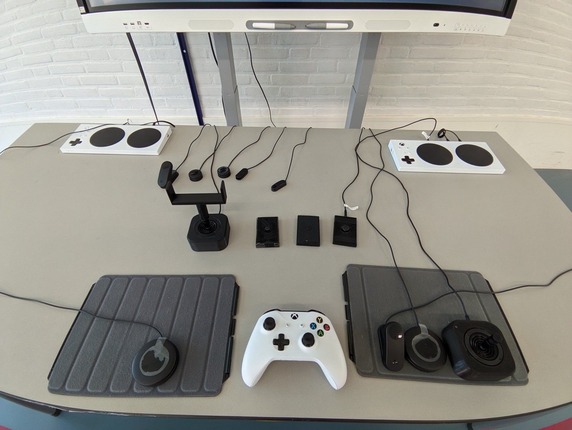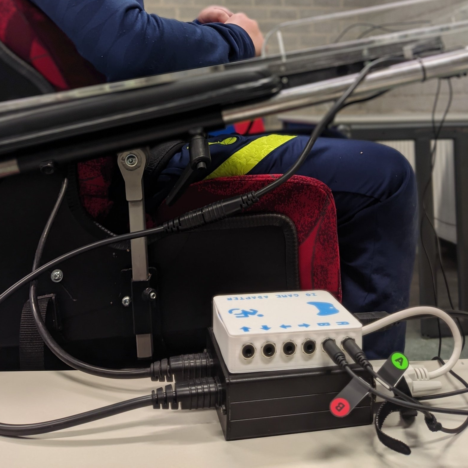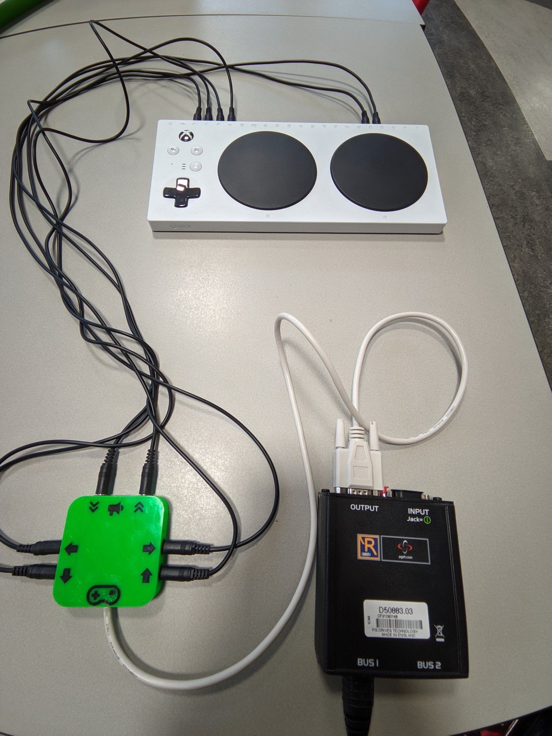 Il primo prototipo funzionante in combinazione con il modulo R-Net IO. L'adattatore è collegato all'Xbox Adaptive Controller tramite sette cavi jack da 3,5 mm. Questi possono essere collegati ai pulsanti desiderati.